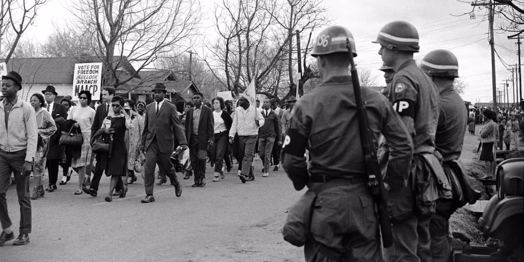 Photo: In 1965, President Lyndon B. Johnson federalized the Alabama National Guard without the consent of Governor George Wallace to protect civil rights marchers during the Selma to Montgomery marches. This action came after state and local authorities failed to protect the marchers and their 1st Amendment rights, and it was taken to ensure the marchers could safely complete their 54-mile journey.