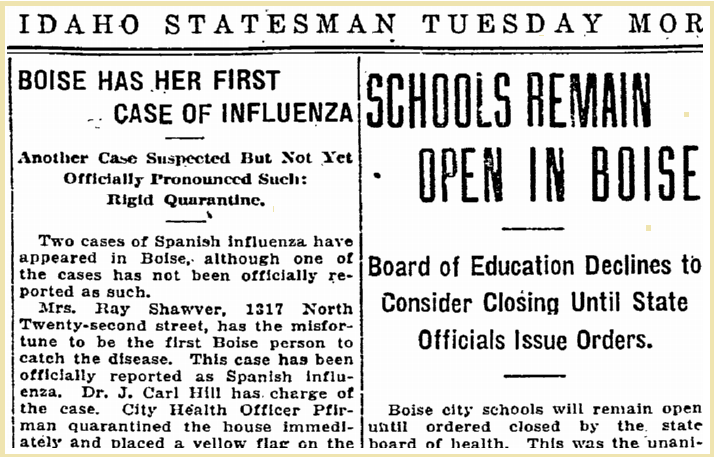 The Boise School Board downplayed the threat as troops returned to Boise and the virus continued to spread. Pictured: Statesman headlines, October 15, 1918.